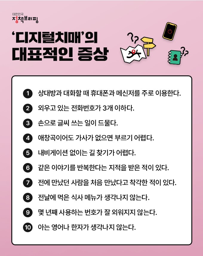위의 10가지는 '디지털치매'의 대표적인 증상으로, 이 중에서 3~4개 이상을 겪고 있다면 '디지털치매'를 의심해 봐야 한다. 물론 '디지털치매'는 의학적으로 질병에 분류되지는 않지만 이것이 습관이 되고, 자주 경험한다면 일상에 지장을 줄 수 있고, 개인적으로도 스트레스를 받을 수 있으며, 실제 치매로도 발전할 가능성이 있으므로 미라 파악해서 나쁠 것은 없다.