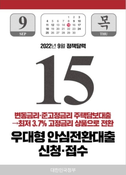 기존 주택담보대출을 받은 분들이 더 좋은 조건의 대출로 갈아탈 수 있도록 9월15일부터 우대형 안심전환대출 신청 접수를 시작합니다.