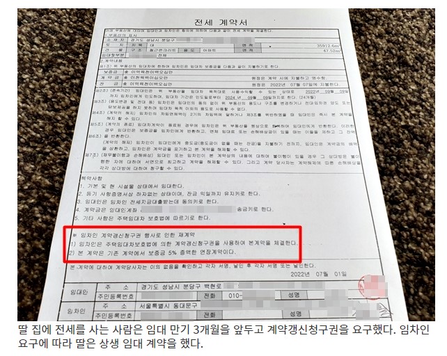 딸이 재임대를 하려면 임대차 3법 적용을 받는다. 2020년7월 31일부터 시행되고 있는 임대차 3법(전월세신고제, 전월세상한제, 계약갱신청구권제)은 임대인이 살던 집에서 2년을 더 안정적으로 거주할 수 있게 한 법안이다. 기간 중 1회에 한해 갱신 요구가 가능하고 임대인은 보증금을 5%이내로 증액할 수 있다. 다만 집주인, 직계존비속이 실거주하려는 경우 임대인이 계약갱신청구권을 거부할 수 있다.